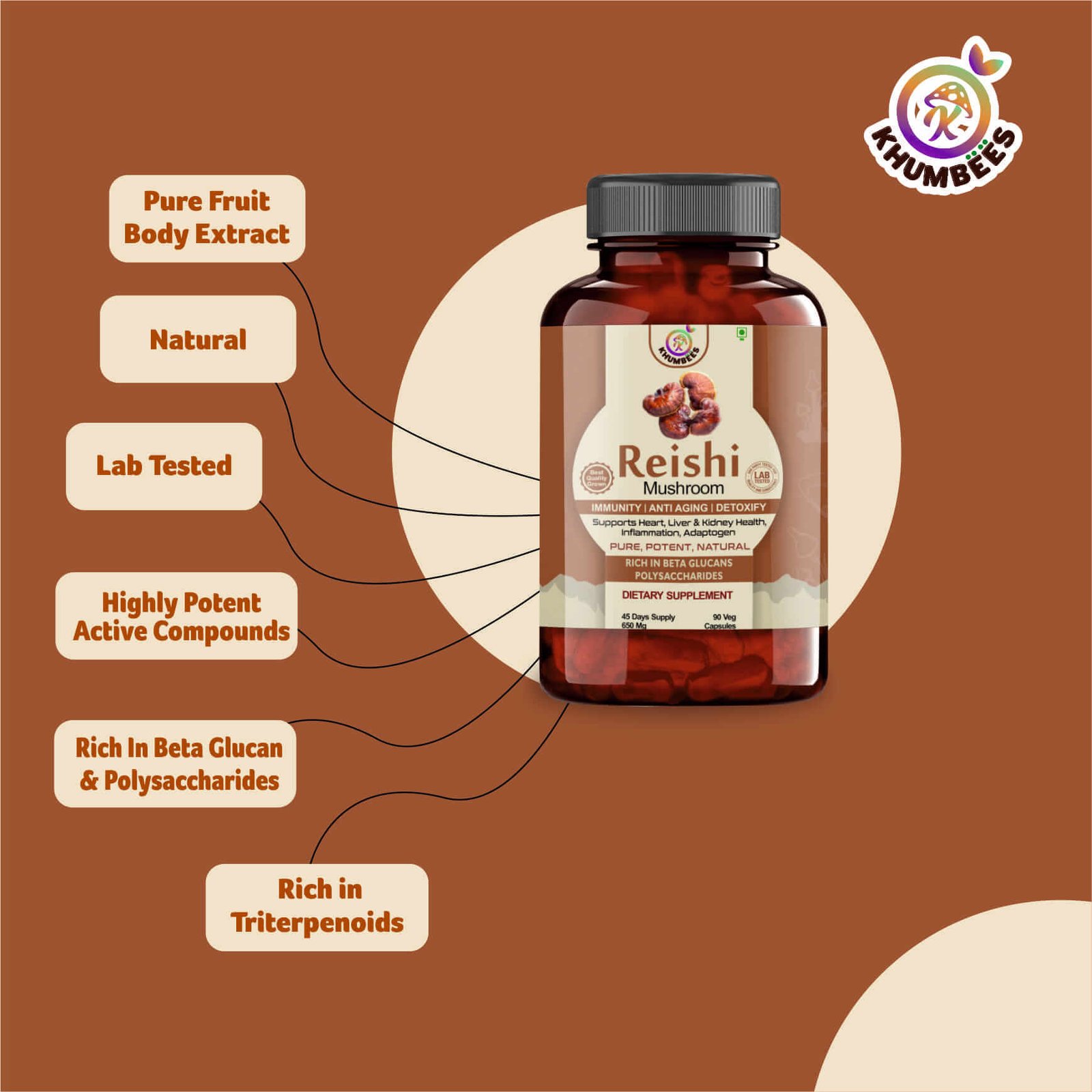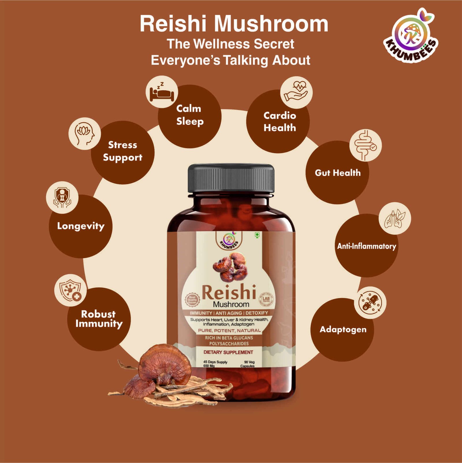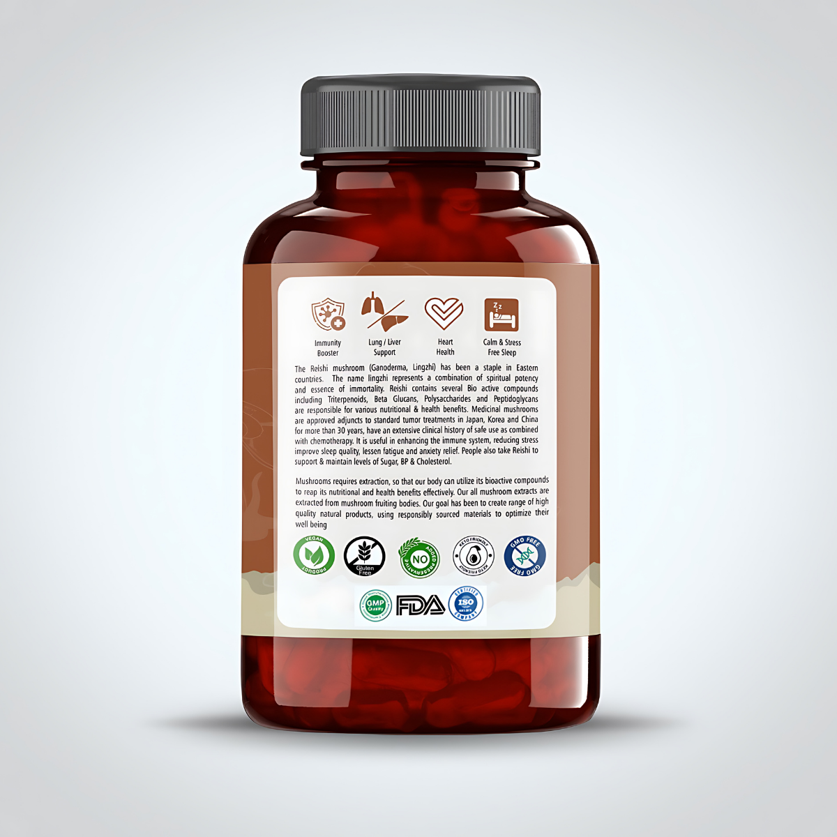 Reishi mushrooms , also known as Ganoderma lucidum or Lingzhi, are a type of fungus that has been used as staple and part of traditional medicine for many centuries in East Asian countries. They are not usually eaten whole because they have a tough, woody texture and a bitter taste. Instead, they are often taken as supplements in different forms. The name Lingzhi comes from a combination of spiritual power and the idea of immortality. Reishi contains several active compounds like Triterpenoids, Beta Glucans, Polysaccharides, and Peptidoglycans, which are responsible for many of its health benefits. Medicinal mushrooms have been used alongside standard cancer treatments in Japan, Korea, and China for over 30 years and have a long history of being used safely with chemotherapy to reduce its side effects.
