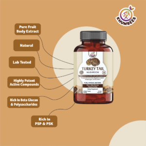 Turkey tail mushrooms (Trametes versicolor, also known as Coriolus versicolor) are medicinal fungi with a long history of use in traditional Eastern medicine. They are named for their colourful, fan-shaped appearance resembling a turkey’s tail. It contains polysaccharide peptide (PSP) and polysaccharide krestin (PSK), which are approved in Japan as an adjuvant therapy in malignant treatment. Turkey tail mushrooms have immune-boosting properties helps in promoting healthy gut bacteria. Studies shows that it has also Anti-bacterial, Anti-viral & and anti-inflammatory properties.